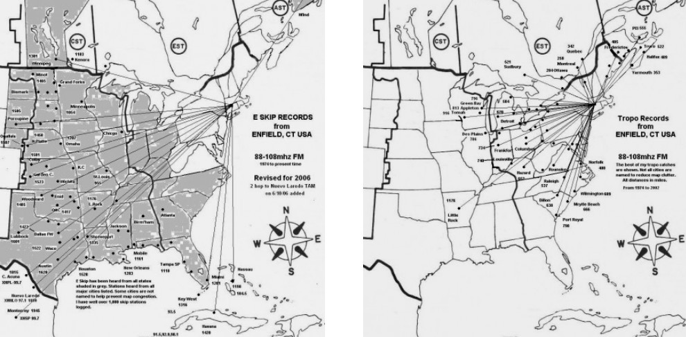 Now we move on to the map on the right, which shows you the places where I’ve heard tropo from. My farthest south is from Port Royal, SC and audio of that reception can be found in DX Audio. As a matter of fact, the audio from many of these can be found there. If you look at the map carefully, you will see Little Rock there. Yes, I did have inland tropo to Arkansas. This was back on September 21, 1978 when a huge high pressure area formed over the central U.S. This is a record reception of two stations, KLAZ 98.5 and KKYK 103.7. You can listen to the audio!