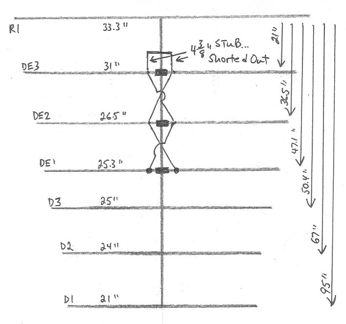 Since this antenna was completely constructed from an old semi-rusted out Winegard PR-5030 TV antenna, I used the same phasing lines from the Winegard. The line between DE1 to DE2 was the exact length anyway, so I simply switched it. The next phasing line from DE2 to DE3 had to be longer, so I cut two sets of the old phasing line and coupled them together to the correct lengt