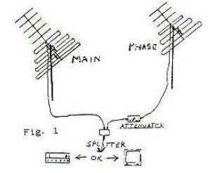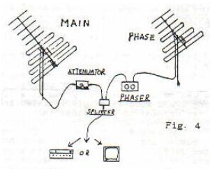 Is your phaser working properly? Installation of the 360 degree phaser is as pictured in Fig 4 except for whatever you decide to use s an antenna switcher for balancing the line. Once everything is installed, we suggest you try a few different cable lengths spliced only into the phase antenna side of the line to see if you can get the phaser to perform any better. There are three warning signs to alert you that a coax jumper needs to be added: (1) You can assume soething is wrong if a station will null while a different station in the same town with the same power will not null. (2) The pointers on the knobs on your phase box usually point down when you reach null. This is an indication that the coax is almost out of range. (3) The left control on the phase box does not seem to do much, or performs sluggishly, when it should have the same sharp peaks as the right control has.In all cases try adding, or removing, 17 inches of coax from the phase antenna side for channels 2-6 and FM, 10 inches for channels 7-13. Ideally the knobs should point near up on the majority of your nulls and both controls should have sharp peaking. If you are still not getting correct or enough nulls try coax jumpers of various lengths. This is not a critical situation and once completed you will not have to mess with jumpers again.