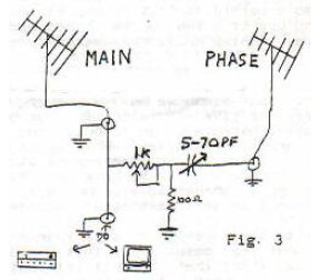 Now, let’s actually use the “phaser” of Fig 1. On FM, let’s assume you aim your main antenna to the side or away from a 50kw station at a distance of 50 miles (90km). That is, aim it where you want to create a null. Now you turn the rotor on the other (phase) antenna in all directions. At the same time the rotor is turning, you turn the attenuator up and down. This may or may not give you a null. Chances are against it, but it’s worth a try. If it fails, move the main antenna 10 degrees amd try it again. It may or may not work, but odds will always be against you. I dub this the “pot luck” circuit. You turn a pot and hope for luck, and in six months hope you haven’t worn your rotor out.